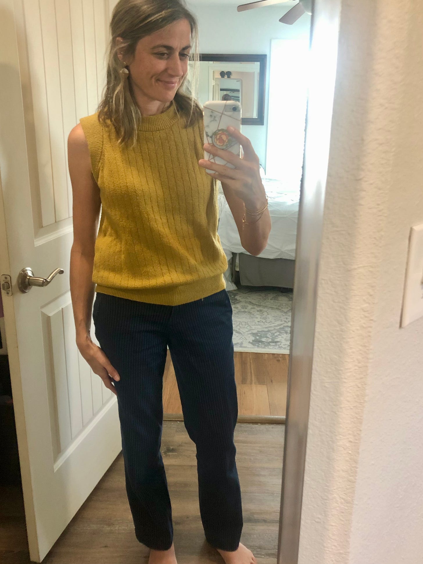 In these still warm days of fall, I’ve loving that sweater vests are in style now. They look fall-ish enough without the full-on warmth of a long sleeve sweater. What a great way to look seasonal and yet not be sweltering. Mine was thrifted but here is a similar one with the same brand.